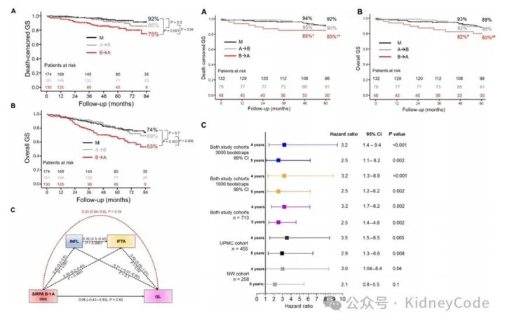 接下来作者对比了三组病人的7年总体移植物存活率,发现B→A不匹配使7年死亡删失存活率降至75%,总体存活率降至53%,风险显著高于A→B不匹配。另外,无论种族背景还是供受者亲缘度如何,SIRPA B→A不匹配均独立地与AR、IFTA和移植物丢失相关。在 UPMC 455例及西北大学258例活体肾移植两个独立队列中,B→A不匹配均使4年死亡删失存活率显著下降,综上证实其可作为跨人群的非HLA预后标志。(图3)