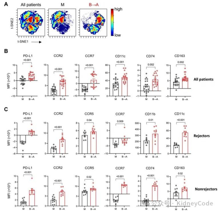 最后,作者进一步通过PBMC光谱流式分析发现SIRPA B→A不匹配术后3个月病人外周血单核细胞高表达 PD-L1、CCR2、CCR7、CD11c、CD74和CD163,呈现系统性活化表型,且该现象与是否发生急性排斥无关。另外同时间点活检显示,不匹配移植物内的 CD68⁺、CD163⁺、M2修复型巨噬细胞显著减少,表明局部抗炎-修复能力减弱。综上说明B→A 不匹配借助 CD47-SIRPα轴在外周与组织层面共同构建促炎、促纤维化微环境,为后续慢性移植物损伤和远期丢失奠定了生物学基础。(图4)