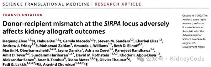 2025年7月,来自美国匹兹堡大学医学院的Aravind Cherukuri团队和Fadi G. Lakkis团队在Science Translational Medicine杂志上发表题为“Donor-recipient mismatch at the SIRPA locus adversely affects kidney allograft outcomes”的文章,该研究发现当移植供受者SIRPα不匹配时,CD47与SIRPα的结合平衡被打破,先天髓系细胞激活,进而驱动排斥发生、早期纤维化和移植物功能丢失等不良反应。这一发现为肾移植提供了新的非HLA预后标志。