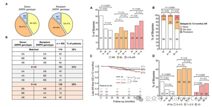 接着,作者通过1000 Genomes数据,对5008例跨族群全基因组数据进行分析,首次绘制出人类SIRPA基因的高分辨率变异图谱,并根据CD47结合的两个关键氨基酸差异将SIRPα基因多态性差异简化为A(v1-like)与B(v2-like)两类功能等位基因。随后,为了探究人类SIRPα不匹配对肾移植病人的影响,作者对在匹兹堡大学医学中心(UPMC)接受肾移植的455例成人供受者进行了SIRPA基因分型。将SIRPA基因型划分为匹配、A→B及B→A三种组合后发现:B→A不匹配(供者B/受者A)使术后1年内迟发性急性排斥(发生在术后5-12个月)风险提高3倍,重度纤维化风险提高3.5倍,并伴随移植肾功能延迟恢复和持续炎症,预示远期移植物失功风险增高。而A→B不匹配仅与移植后第一年内早期排斥及间质纤维化(IFTA)相关,提示供体高亲和力B型SIRPα通过活化宿主单核细胞,引发持续炎症反应。(图2)